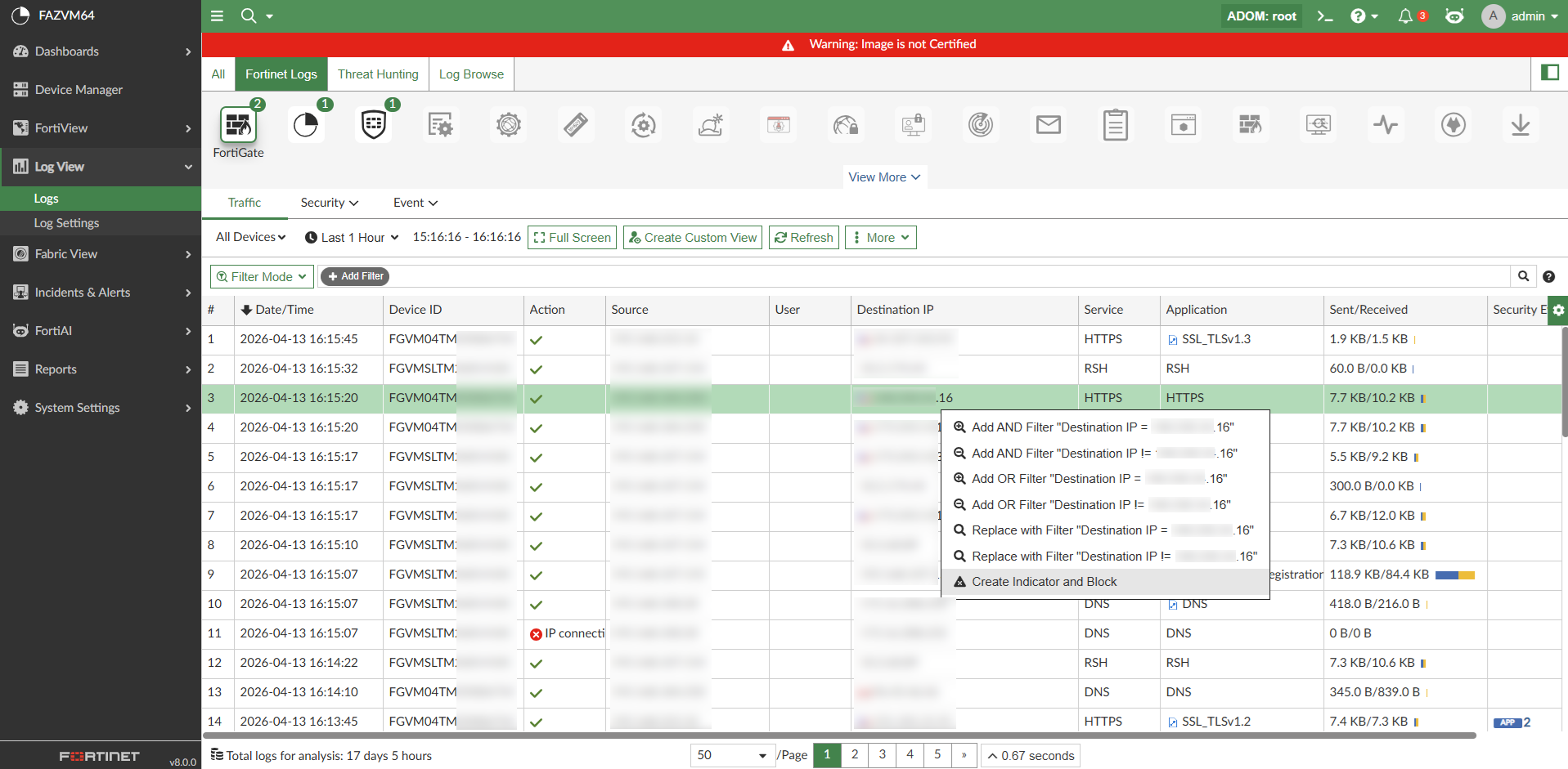 You can block suspicious indicators directly from FortiAnalyzer. This can help you to reduce potential risks and quickly respond to known threats by blocking suspicious IPs, URLs, domains, or MAC addresses.