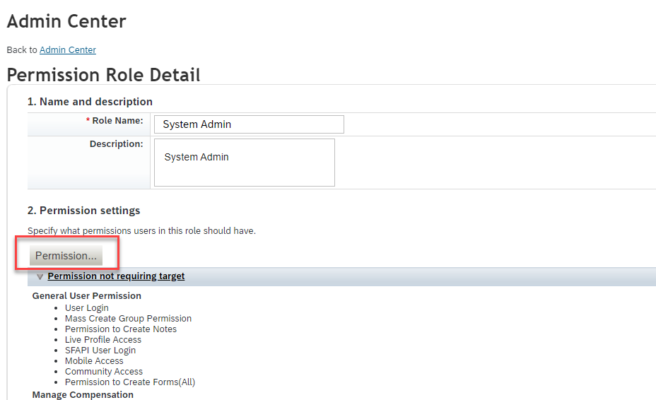 - In Permission Role Detail, click on Permission button to configure the permission settings.