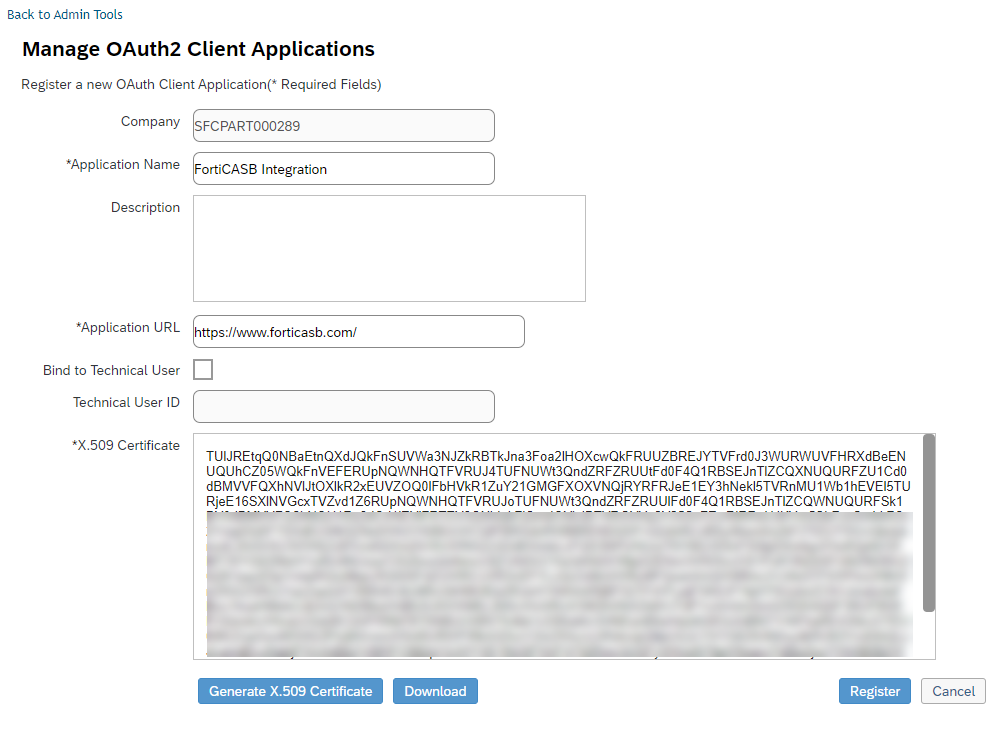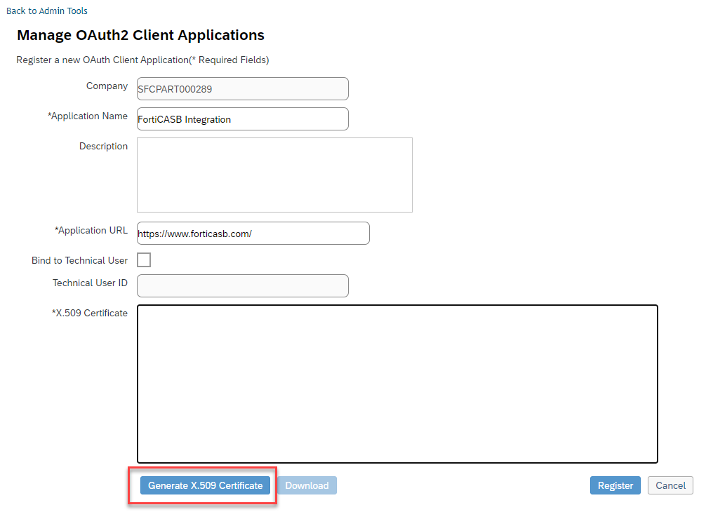 At the bottom of the page, click Generate X.509 Certificate to register a certificate.