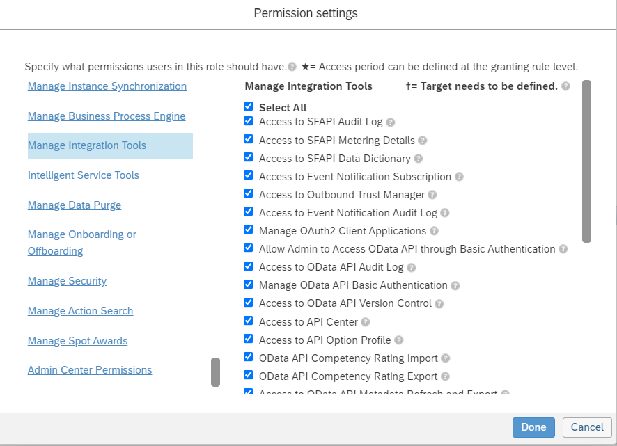 - Scroll down and select Manage Integration Tools, click Select All to add all integration permissions, and click Done.
