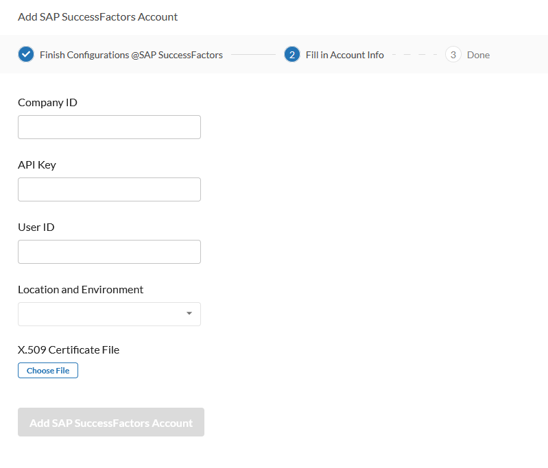 - Upload the X.509 Certificate pem file saved from earlier and click Add SAP Success Factors Account.