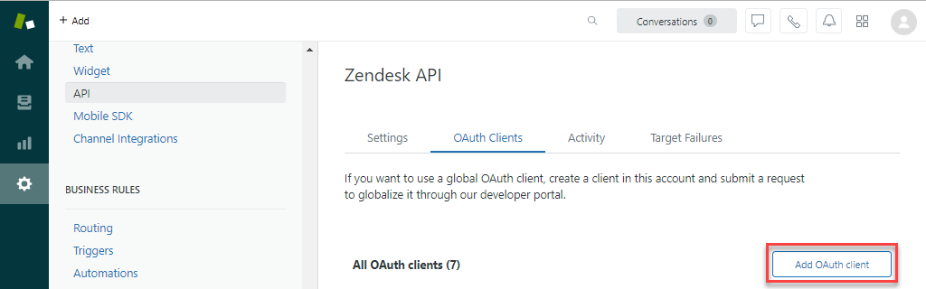 , scroll down to Channels, and click on API. - In Zendesk API page, select OAuth Clients tab, then click Add OAuth client.