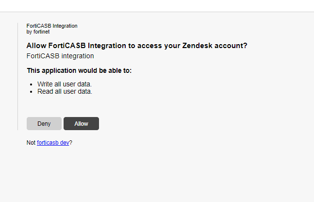- You will be prompt to authorize FortiCASB to access to your Zendesk account, click Allow to complete adding the Zendesk account.