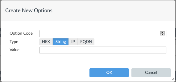 Option Code Enter the option code. Type Select HEX, String, IP, or FQDN Value Enter the corresponding hexadecimal value.