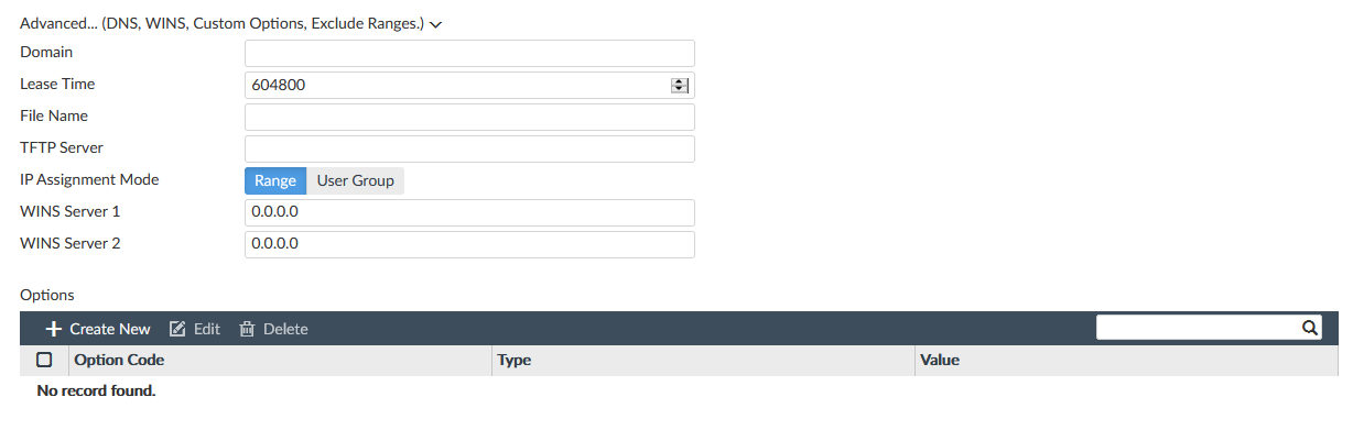- Expand Advanced...(DNS, WINS, Custom Options, Exclude Ranges.).