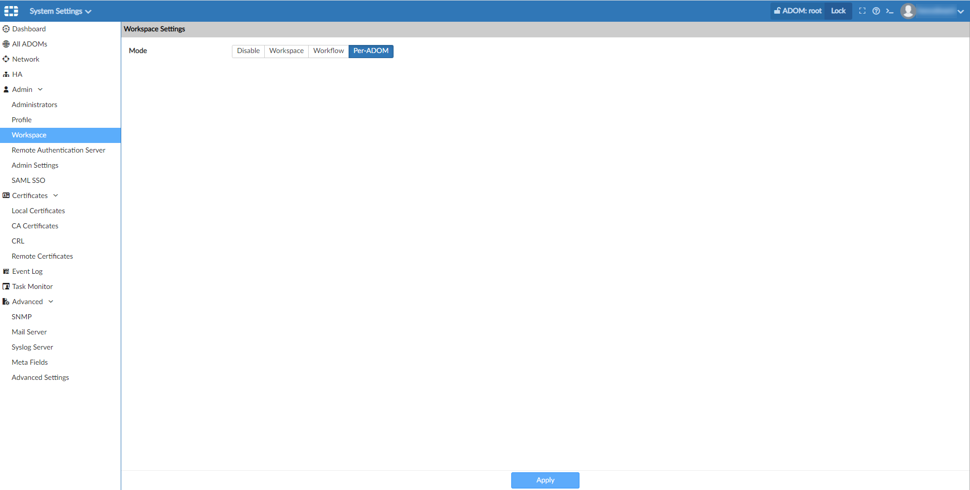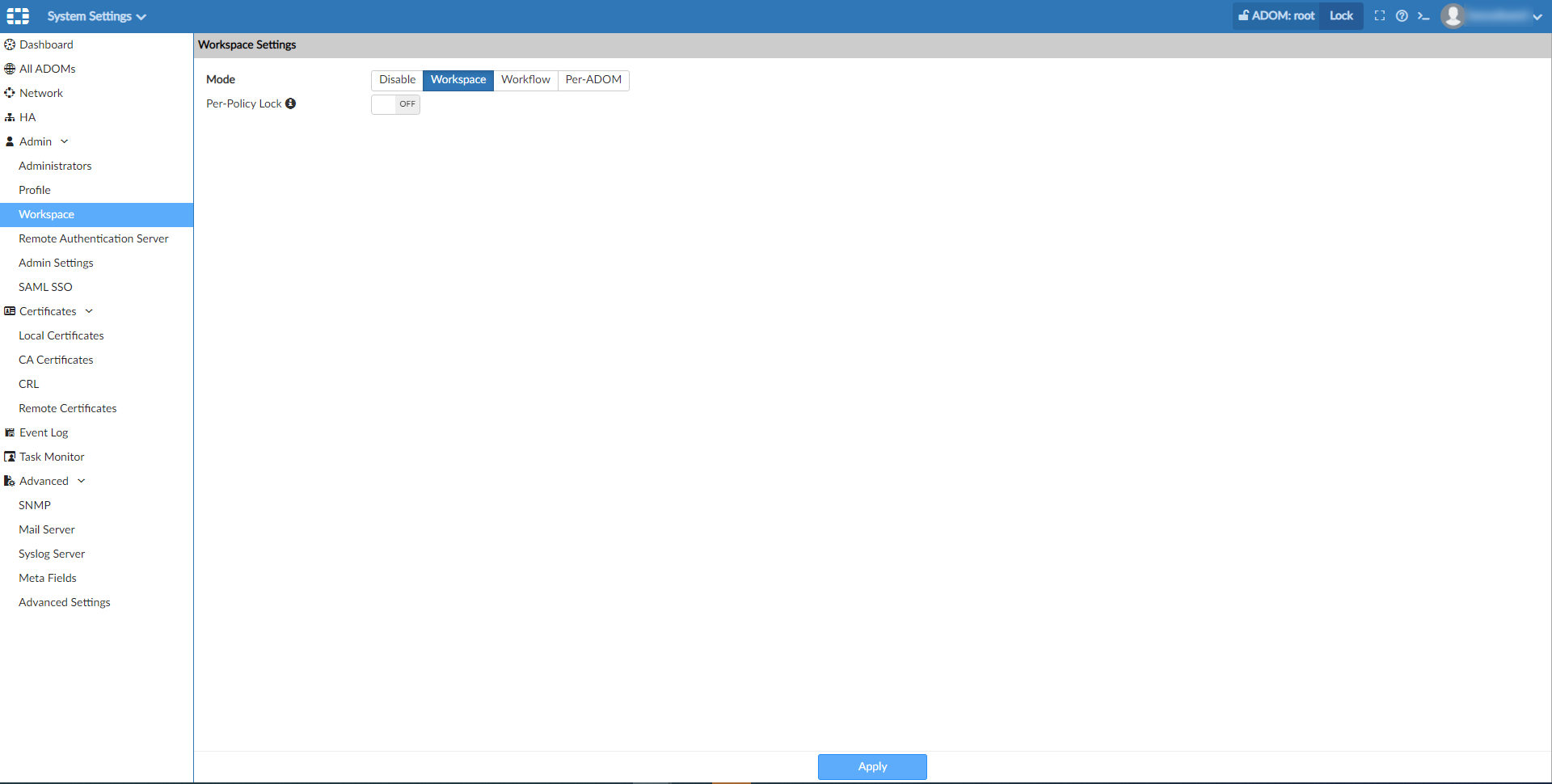 After the Per-ADOM setting is enabled, you can update the workspace setting in the GUI.