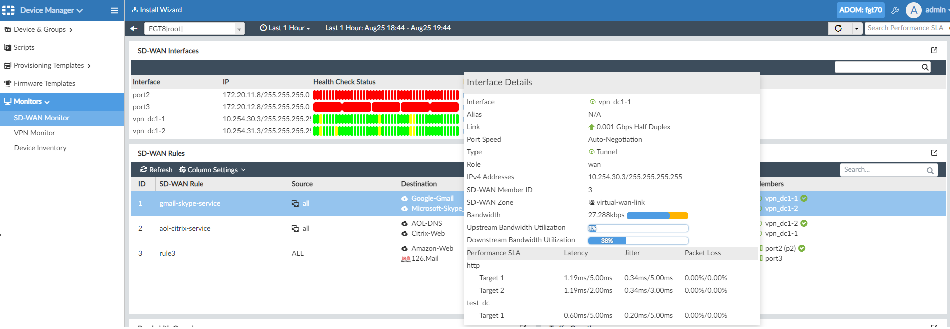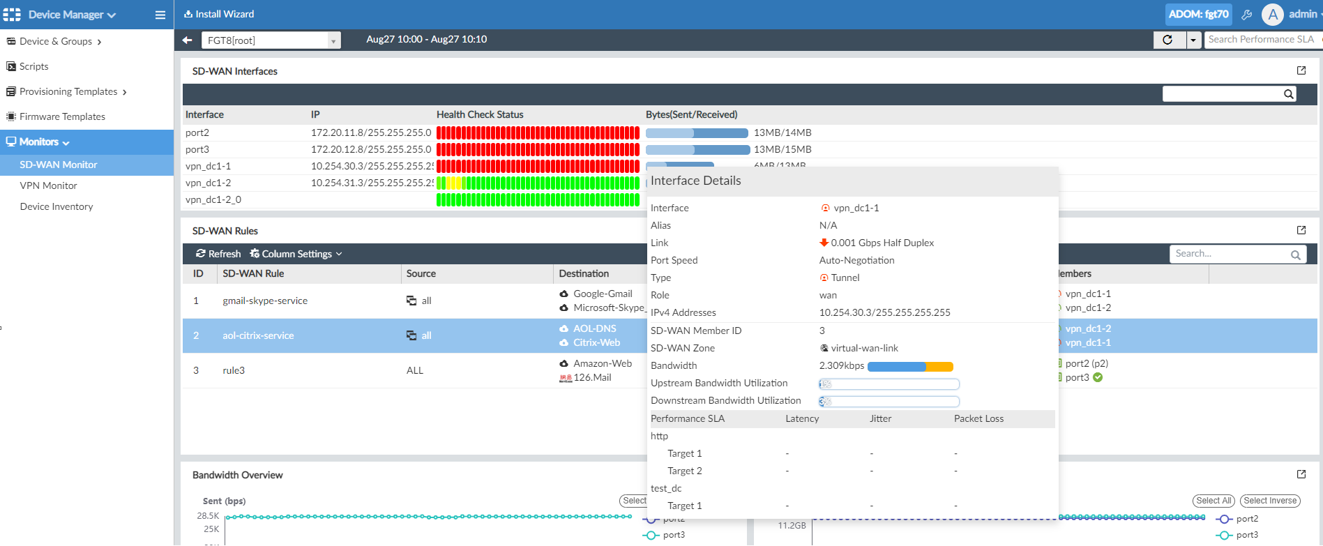 By default, SD-WAN Monitoring History is disabled. When this feature is disabled, data for only the last 10 minutes is displayed. You can refresh to view the data directly from FortiGate devices. No historical data is stored in FortiManager when this feature is disabled.