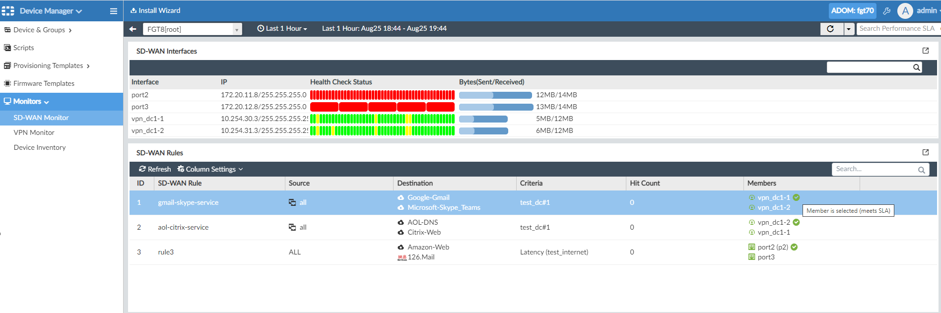 - Active (referred to as selected) interfaces are identified with check mark icon in the SD-WAN Rules table. You can see why an interface is selected by hovering your mouse over the interface.