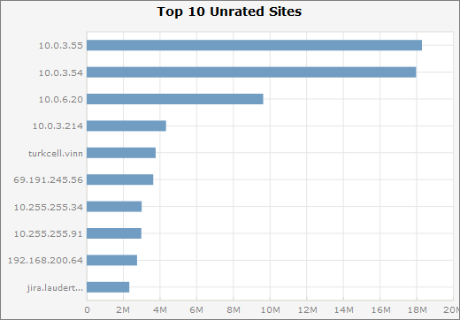 Displays the top 10 unrated sites and the number of events. Hover the cursor over a row to see the exact number of queries. |
