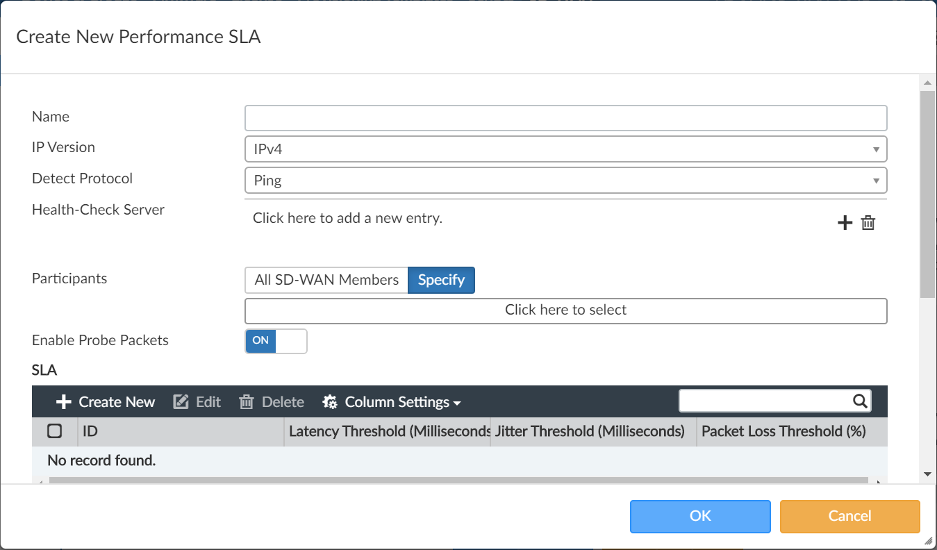 - Configure the options, and click OK to create the performance SLA.