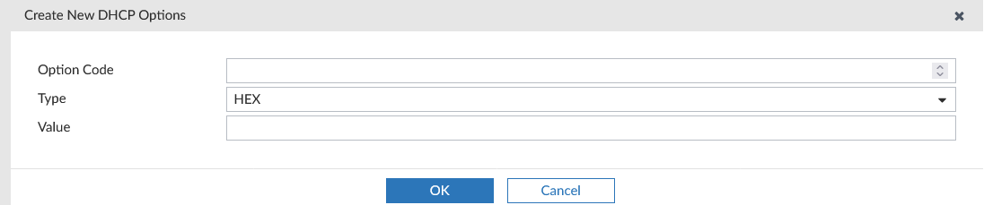 Option Code Enter the option code. Type Select HEX, String, IP, or FQDN Value Enter the corresponding hexadecimal value.