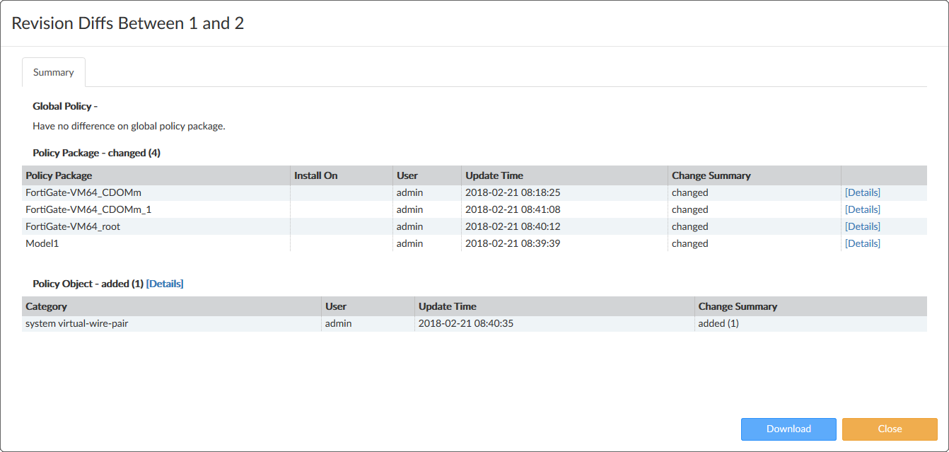 - Select Details to view specific changes within a policy package or the policy objects.