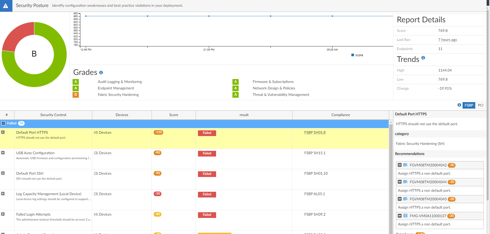 The report includes the security controls that were tested against, linking to specific FSBP or PCI compliance policies. Click the FSBP and PCI buttons to reference the corresponding standard. Users can search or filter the report results.