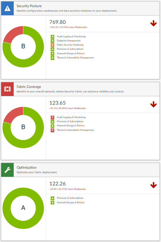 The Security Rating pane is separated into three major scorecards: Security Posture, Fabric Coverage, and Optimization, which provide an executive summary of the three largest areas of security focus in the Security Fabric.