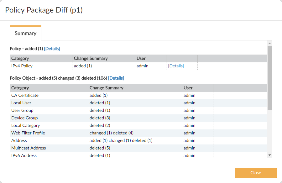 - Beside Policy Object, click the Details link to display details about the policy object changes.
