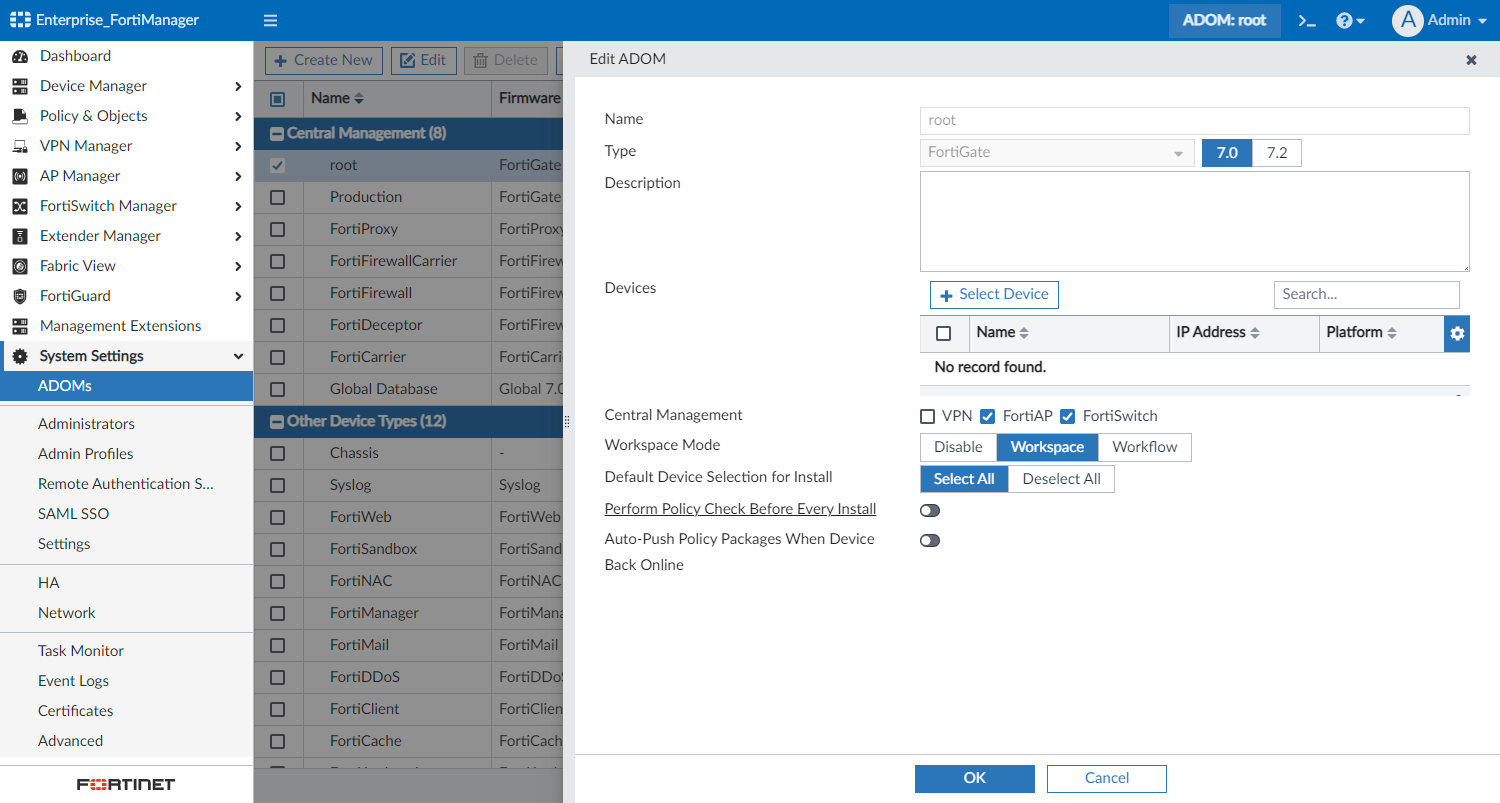 Workspace mode can be applied per ADOM or on all ADOMS. See Enable workspace mode. |