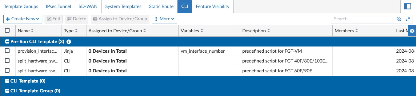 CLI templates can be put into groups so that multiple templates may be assigned to managed devices at the same time.