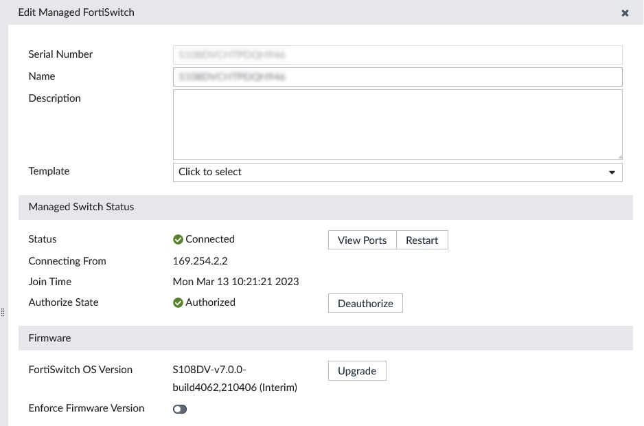 Select the template that will be applied to the FortiSwitch from the dropdown list. Only applicable templates are available.