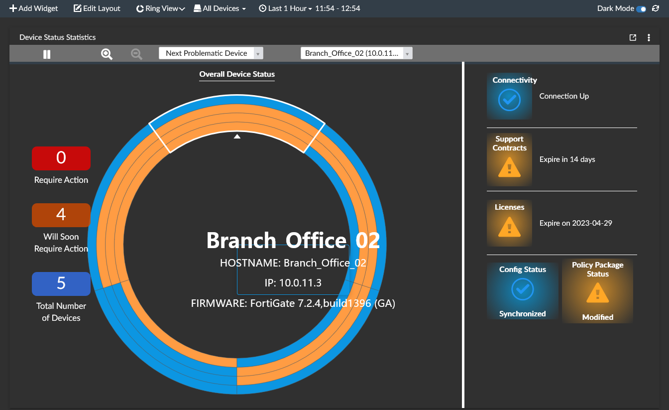 The Ring View dashboard communicates the configuration status between FortiManager and managed devices.