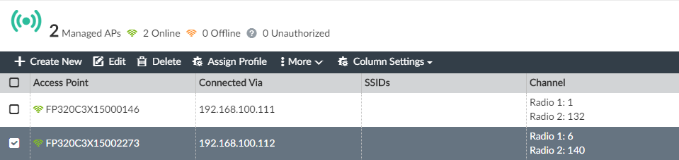 - Select the unknown FortiAP devices and either click More > Authorize from the toolbar, or right-click and select Authorize. Allow a few moments for the APs to authorize.