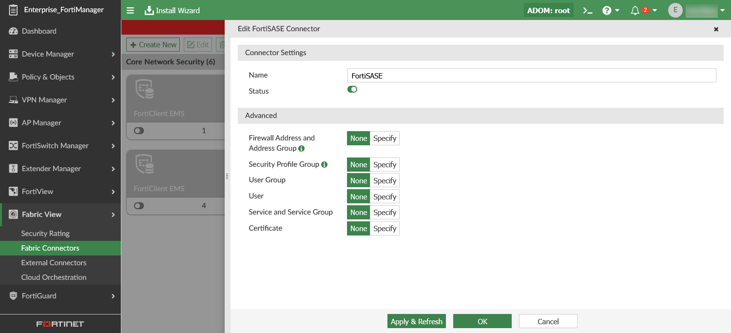 Toggle the status of the connector ON. Advanced You can define the supported FortiManager objects to be synchronized to FortiSASE.