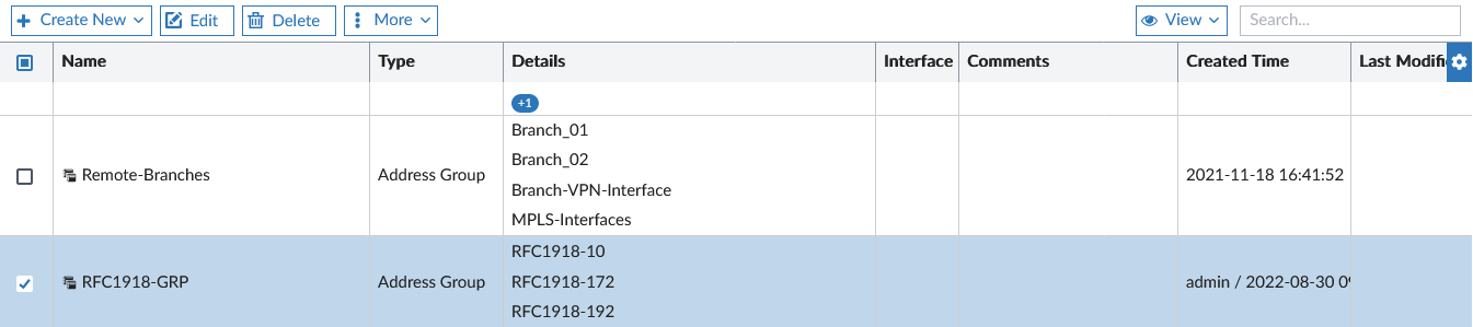 The following default RFC1918 address group containing the three address objects is available under Address Group: