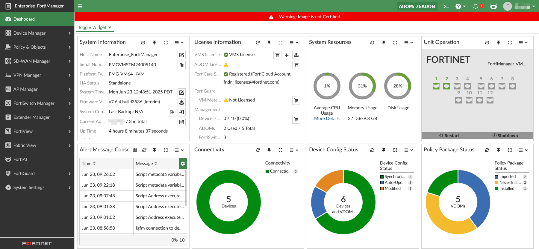 When you log into the FortiManager GUI, the Dashboard pane is displayed. The Dashboard contains widgets that provide performance and status information. For more information about the Dashboard, see Dashboard
