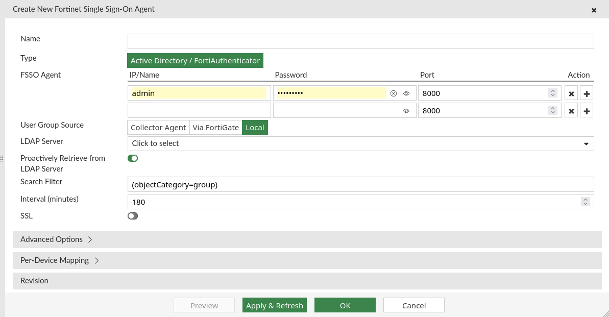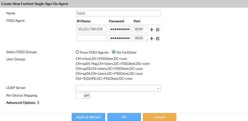 Click Create New > Fortinet Single Sign-On Agent from the dropdown list. The Create New Fortinet Single Sign-On Agent window opens.