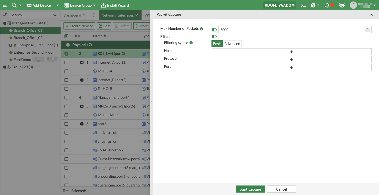 You can perform packet capture on a managed FortiGate's interface through the device database.