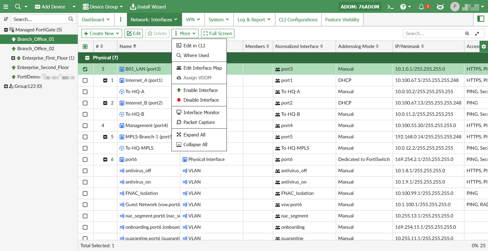 In Device Manager, select a FortiGate and go to Network> Interfaces.