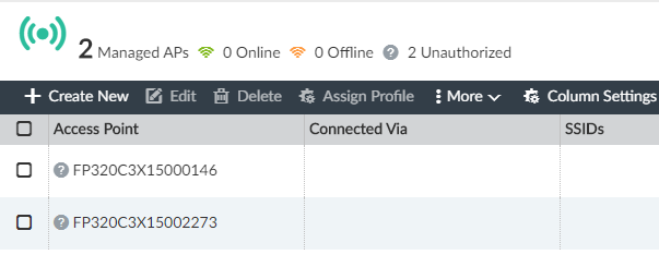 - Select the unknown FortiAP devices and either click More > Authorize from the toolbar, or right-click and select Authorize. Allow a few moments for the APs to authorize.