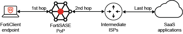 When an endpoint is connected to the FortiSASE VPN tunnel, it accesses SaaS applications using SIA. Thus, the first and second hops of the trace are the entry and exit interface IP address of the FortiSASE PoP that the endpoint is connected to. The remaining hops are the ISPs in between until the last hop, which is the selected SaaS application.