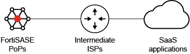 DEM displays a list of SaaS applications and health check metrics for first-mile connectivity between the geographical PoPs provisioned for your FortiSASE instance and SaaS applications, as the following diagram shows. See Digital Experience Monitoring.