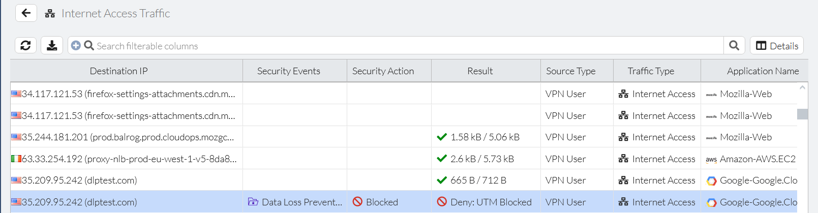- Go to Analytics > Security > Traffic > Internet Access Traffic and confirm that FortiSASE generated a DLP block log entry that corresponds to your VPN user and visiting https://dlptest.com/https-post/