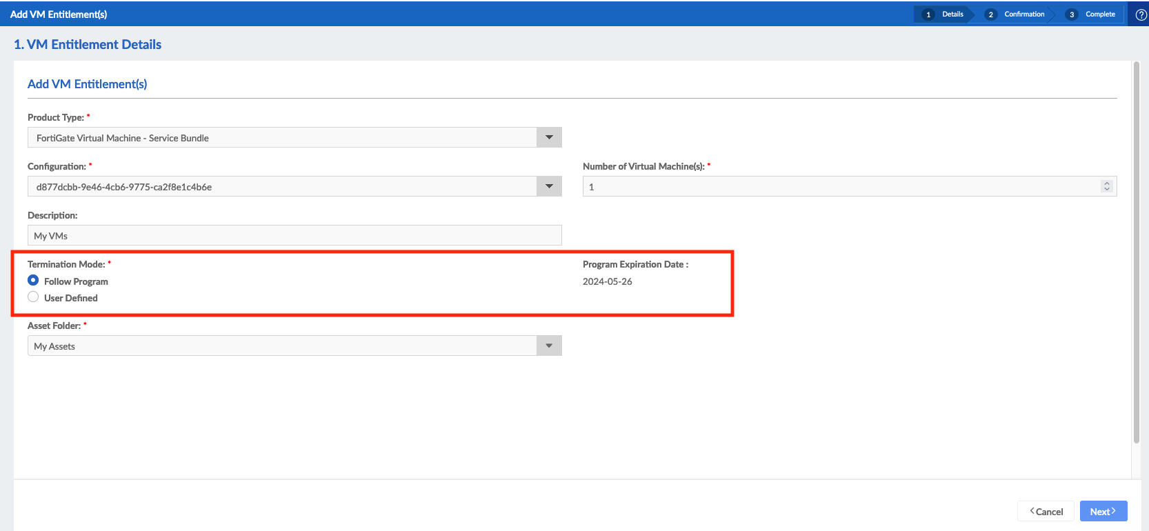 This tells FortiFlex to update the expiration date of all VM entitlements that have the Termination Mode set to Follow Program, to the expiration date of the new contract that is being registered.