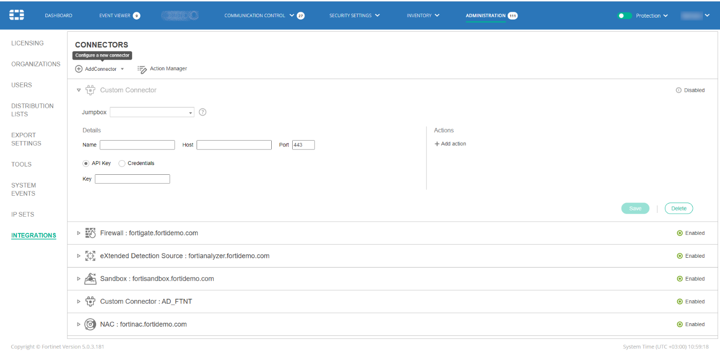 Jumpbox Select the EDR Jumpbox that will communicate with the third-party system. An EDR deployment must include a Jumpbox that has connectivity to the external system of this custom integration connector. This Jumpbox must be exclusive to this organization and cannot function as a Core. Name Specify a name of your choice to be used to identify this custom connector. Host Specify the IP or DNS address of the relevant third-party application. Port Specify the port that is used for API communication with the relevant third-party application. API Key/Credentials Specify authentication details of the relevant third-party application. To use an API token, click the API Key radio button and copy the token value into the text box. To use API credentials, click the Credentials radio button and enter the relevant third-party application’s API username and password. - In the Actions area on the right, define the action to be taken by this custom connector, as follows: