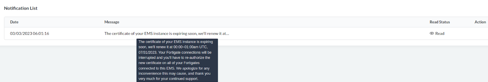 The following shows an example of a targeted notification for EMS certificate renewal: