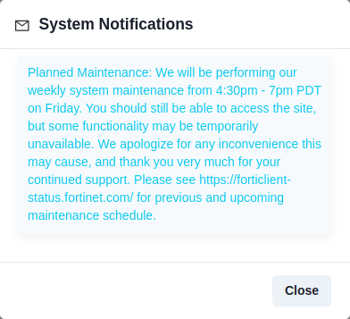 These notifications alert you to system maintenance that is planned for all users in that datacenter due to a release, backend environment issue, or maintenance need. There is no action required for customers. You can view this notification from the GUI: