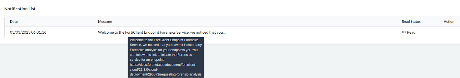 These notifications target specific customers and may require an action from the user. You can find them in the Notifications tab on the left panel. The following shows an example of a targeted notification for a new Forensics service user: