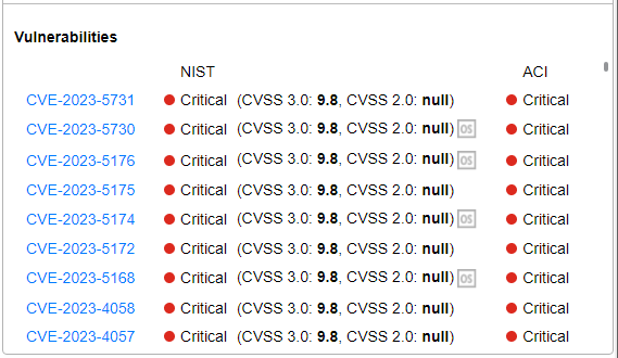 The Vulnerabilities area at the bottom right of the window lists the CVE-identified vulnerabilities for the selected application and version. Each CVE row includes the CVE identifier, the NIST and ACI severity category and the Common Vulnerability Scoring System (CVSS) vulnerability score .