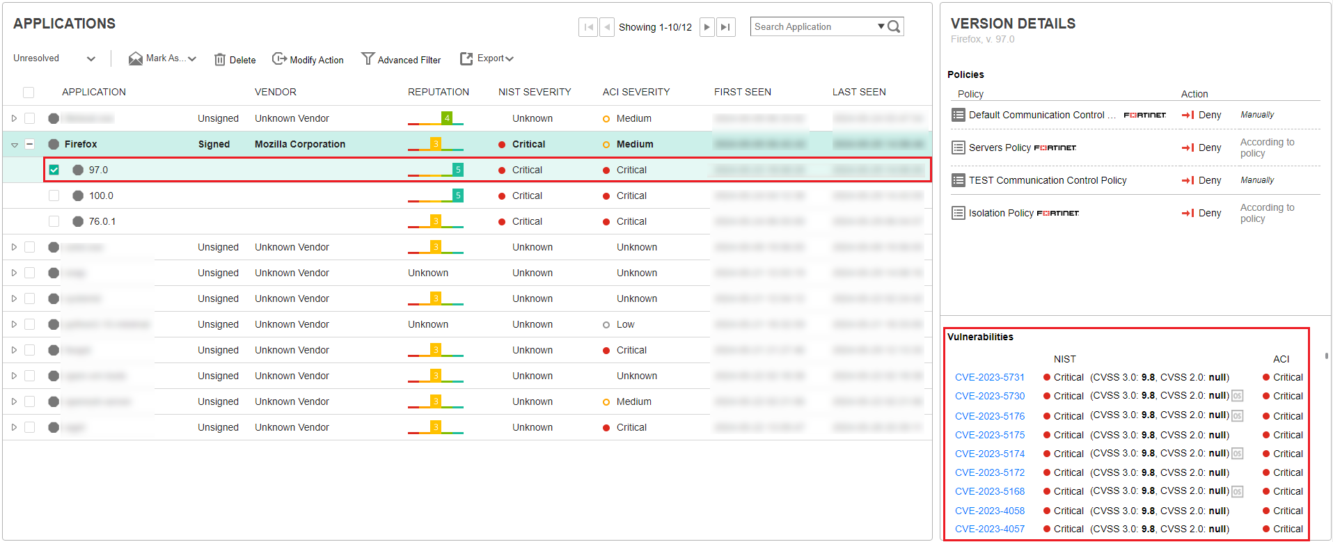 Each application and version in the application list shows two severity ratings: