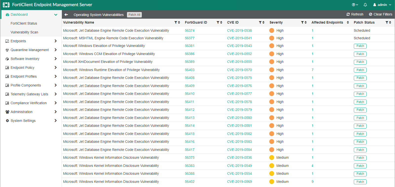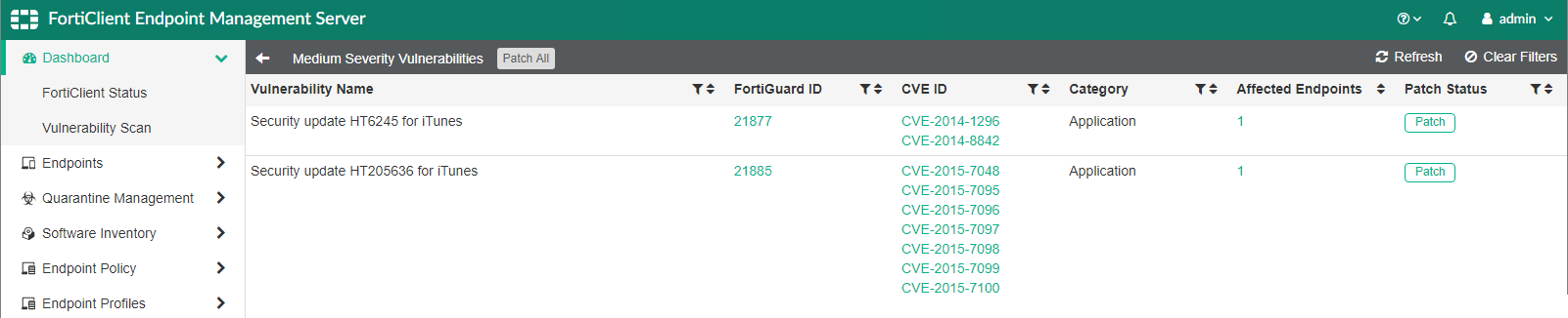 You can click the Patch button to patch the selected vulnerability with the next Telemetry communication between FortiEndpoint and the endpoint.