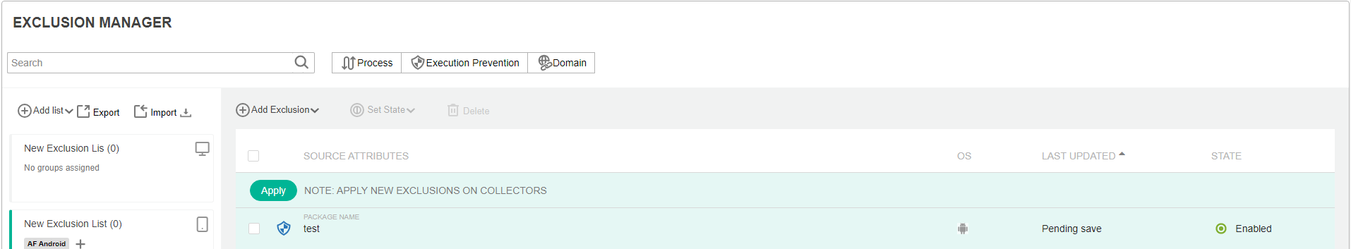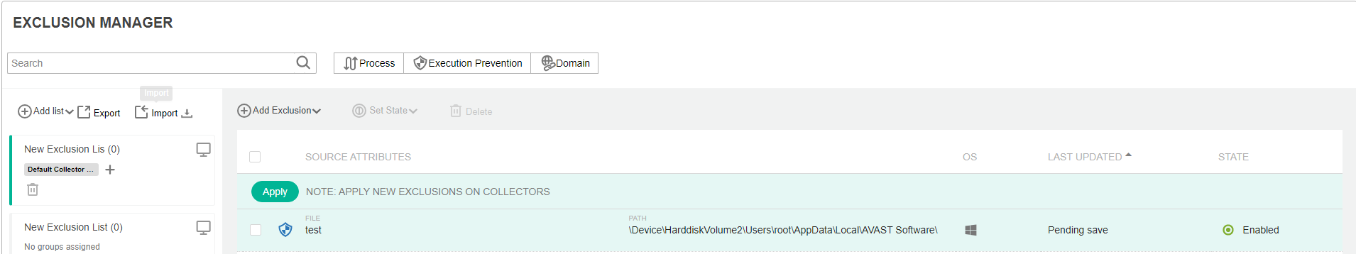 - The newly defined exclusion appears with a green background and the words Pending save appear in its LAST UPDATED column. To define that these exclusions take effect, you must click the Apply button and then click the Save button in the window that pops up. Their LAST UPDATED column then shows the timestamp when they were saved.