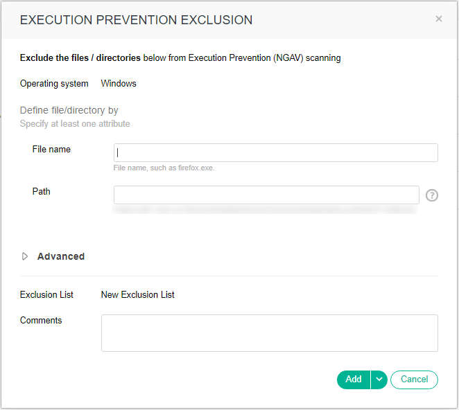 - In the right pane, click the + Add Exclusion button and select Execution Prevention. Depending on the exclusion list type (PC or mobile), one of the following windows displays: