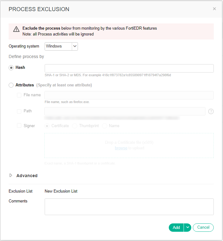 - Define the processes to be excluded using one of the following options: Hash or any combination of File Name / Path / Signer, as follows: