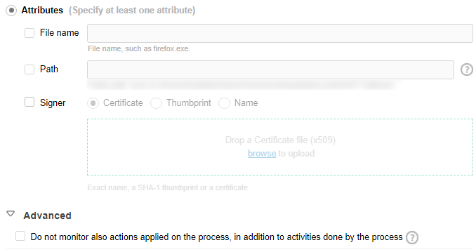 When a process is identified by file name and/or path only (which means Signer is not selected), you can disable monitoring of the process completely, including actions applied on the process, by selecting Do not monitor also actions applied on the process, in addition to activities done by the process under Advanced.