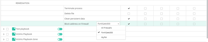 - Open the Playbook policy that is applied on devices for which you want the block IP incident response to apply and place a checkmark in the relevant Classification column next to the Block address on Firewall row that is under the REMEDIATION section. In the dropdown menu next to the action, you can specify which firewalls to use to perform the block or select all of them, as shown below: