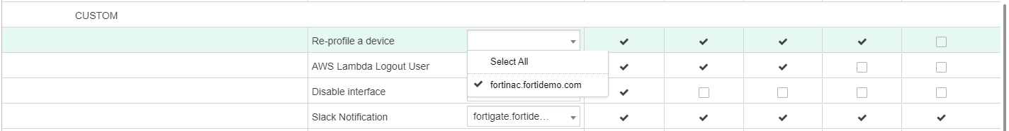 - In the dropdown menu next to the relevant custom action, select the relevant firewall connector with which to perform the action, as shown below:
