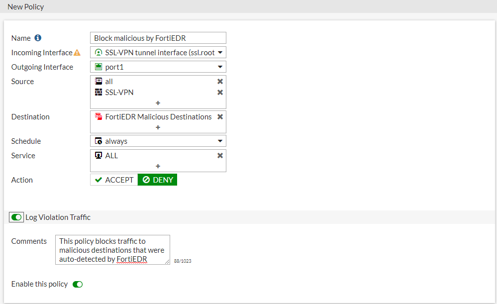 The example below describes how to define an address group on FortiGate and associate it with a FortiGate policy rule, such that it blocks connections to the addresses in the group. The address group is then used when configuring the EDR connector so that it is automatically populated with malicious destinations upon detection by EDR.