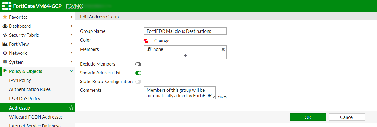 - Create a new address group to be populated by EDR. The new address group now appears in the FortiGate Addresses table.